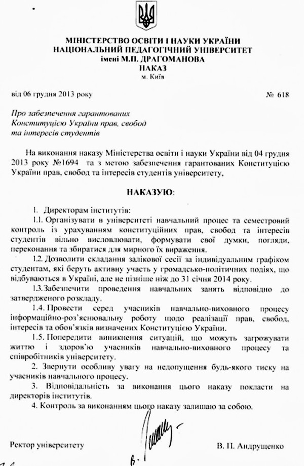 Студенты Национального педагогического университета им. Драгоманова добились переноса зачетной сессии. Исключение сделают для учащихся, которые принимают участие в массовых акциях протеста на Майдане Незалежности.