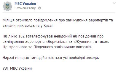 Милиция получила сообщение о заминировании аэропортов и железнодорожных вокзалов в Киеве.