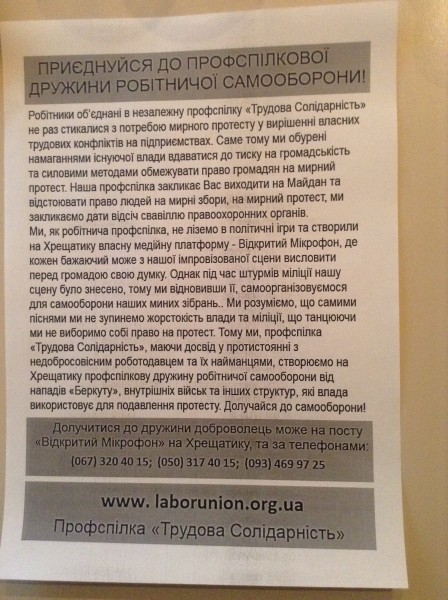 «После того, как Беркут снес платформу «Открытый микрофон Майдана» профсоюза «Трудовая солидарность», активисты приняли решение создать собственные отряды рабочей дружины» – рассказал Виталий Махинько.