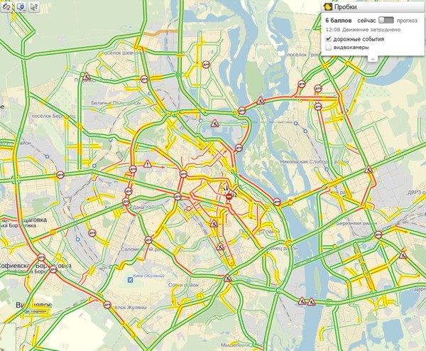 Пробки в Киеве достигли 6 баллов по 10-балльной шкале системы "Яндекс. Пробки". Сервис характеризует ситуацию на дорогах как "движение затруднено".