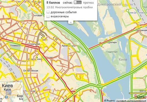 Затор на бульваре Дружбы народов, пробка на бульваре Леси Украинки, традиционно стоит улица Вадима Гетьмана, бульвар Шевченко, Краснозвездный проспект, пробка на Набережно-Крещатицкой и Надднепрянском шоссе. Там, кстати, перекрыли дорогу бойцы полка ДПС ГАИ.