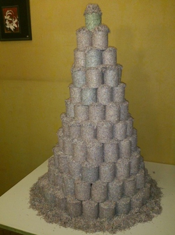 «Мы увидели, что Нацбанк их просто выбрасывает, как раз стояли два мусорных контейнера, забитых этими брикетами. Насобирали, заказали, машину, привезли их домой. Они долго стояли без дела, мы думали, что с ними делать. Идея сделать елку пришла в голову случайно. Получилась действительно крутая, самая дорогая, стоит 3 миллиона гривен», - рассказал Владимир.