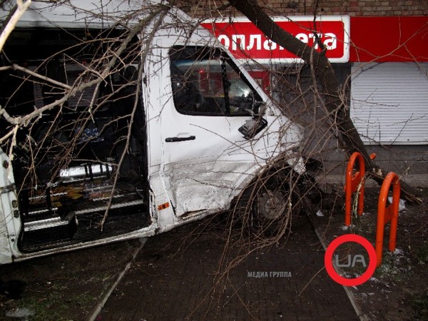 Водителю чудом удалось увернуться от мощного столба светофорной стойки, но маршрутка снесла дерево и помчала в сторону магазина, где торгуют велосипедами. В полуметре от входа машина, к счастью, остановилась.