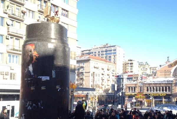 Стоит напомнить, что ранее на этом месте стоял памятник Владимиру Ленину. Однако 8 декабря 2013 года участники акции протеста сбросили памятник на землю и разбили его на части кувалдами.