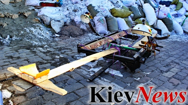 На баррикадах по улице Грушевского установлена катапульта, которую активисты могут привести в боеготовность в любую минуту. Сооружена она из автомобильной рамы, досок и двух мисок, закрепленных на рычагах для метания снарядов.