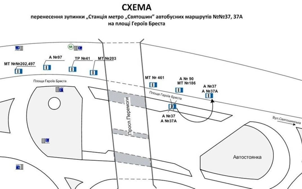 Конечная остановка столичных автобусов «Станция метро «Святошин», следующих по маршрутам № 37 и 37А, перенесена из внутреннего проезда на основную дорогу, сообщили в «Киевпасстрансе».