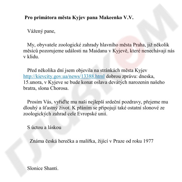 Cлониха из Пражского зоопарка обратилась к новому главе Киевской горадминистрации Владимиру Макеенко. Соответствующее письмо вчера получила редакция «Главкома».