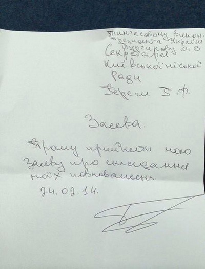 Секретарь Киевского городского совета Галина Герега и глава Соломенской райгорадминистрации Максим Луцкий написали на имя исполняющего обязанности президента Украины — спикера Верховной Рады Александра Турчинова заявление о сложении своих полномочий.