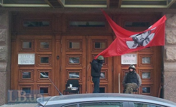 В настоящее время в дверных проемах приклеены картонки с надписью "Штаб Братства", на крыльце закреплен флаг организации. Офис охраняют два бойца, экипированных по виду - как представители Самообороны.