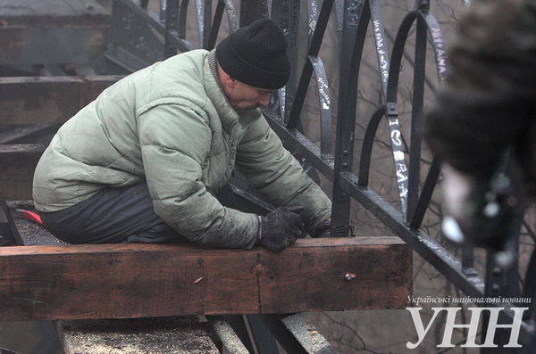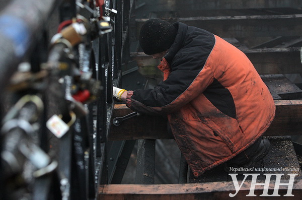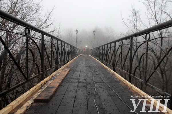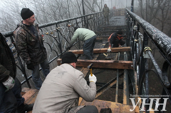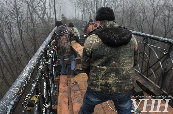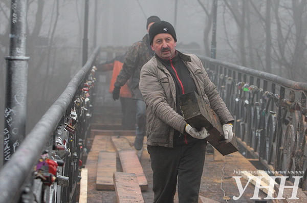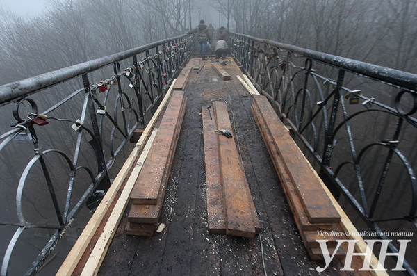 В Киеве начался ремонт «Моста влюбленных» в Мариинском парке, который был сожжен во время протестных акций на ул. Грушевского.