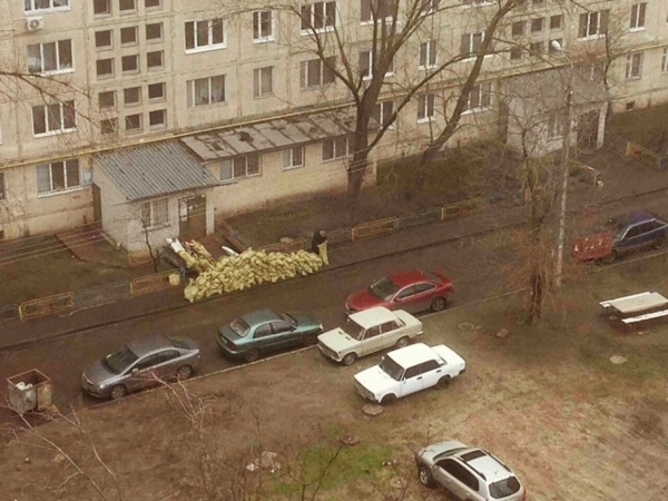 Так, в одном из дворов Оболонского района, житель дома решил возвести баррикаду прямо около подъезда, тем самым, практически полностью загородив парадный вход.