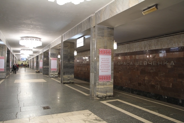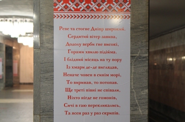 Так, как сообщили в пресс-службе столичной подземки, на колоннах станции «Тараса Шевченко» появились плакаты со стихами Кобзаря, которые оформлены под полотенца национального стиля.