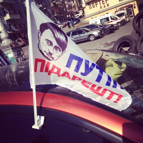 Автомобильные флажки, магниты с изображением стилизованного под Гитлера Путина либо изображения, на которых так или иначе российский президент сравнивается с нацистским фюрером, можно найти в ассортименте многих сувенирных лавок.