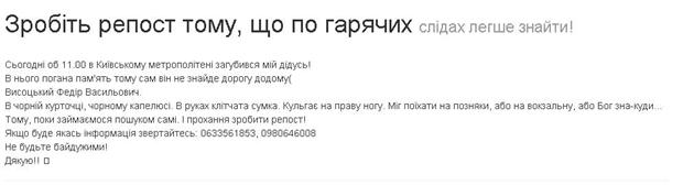 «Одет был в черную курточку и черную шляпу. В руках клетчатая сумка. Хромает на правую ногу. Мог поехать на Позняки, или на Вокзальную, или Бог знает куда ...», - сказано в сообщении.