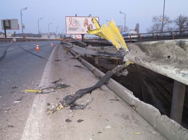 В ночь на воскресенье около 3:45 на Южном мосту произошла авария, в которой погиб 25-летний киевлянин. По информации источника «Сегодня» в ГАИ, автомобиль Renault двигался в направлении Борисполя и, по предварительной информации, водитель потерял контроль над управлением и автомобиль несколько раз врезался в отбойник.