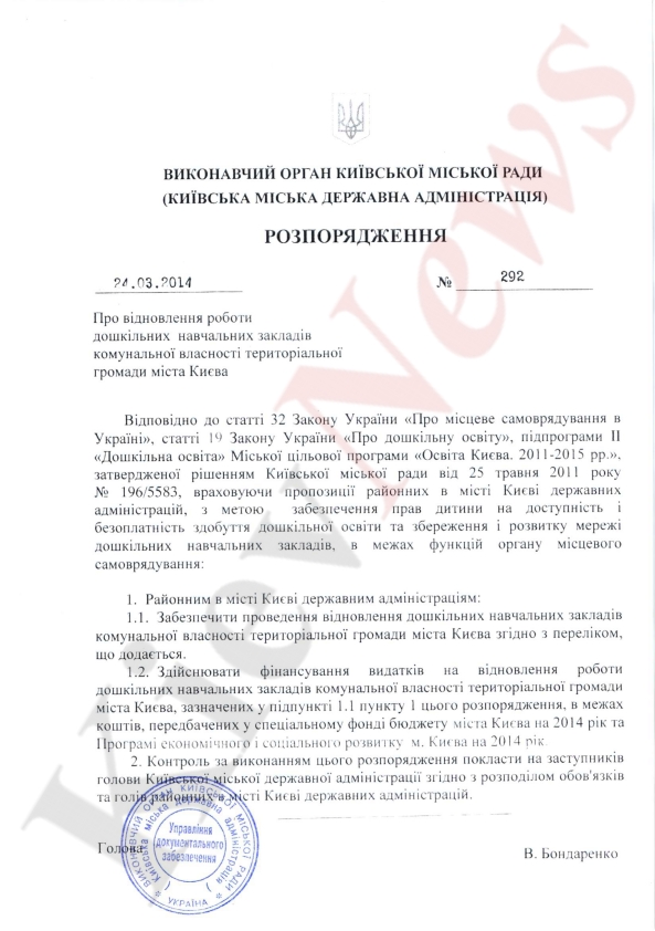 В течение 2014 года обновят и модернизируют 12 дошкольных учебных заведений коммунальной формы собственности. Соответствующее распоряжение подписал председатель КГГА Владимир Бондаренко. Об этом сообщает пресс-служба горадминистрации.