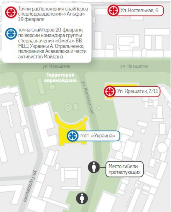 - Ул. Крещатик, 7/11, ул. Костельная, 6 — точки расположения снайперов спецподразделения «Альфа» 18 февраля, которые назвал глава СБУ