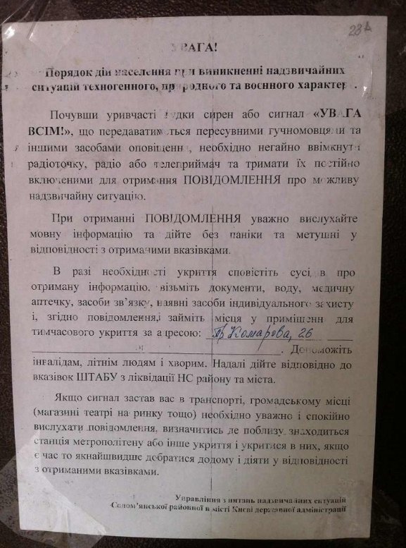 Управление по вопросам чрезвычайных ситуаций Соломенской райадминистрации в Киеве начало оповещать жителей столицы, что следует предпринимать в случае возникновения чрезвычайной ситуации, о чем их оповестят прерывающиеся гудки сирены или сигнал «Внимание всем!».