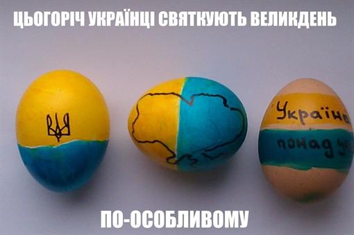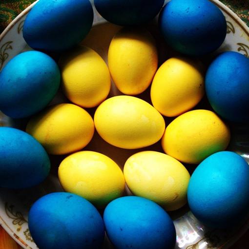 Яйца народ красит в голубой и желтый, а иногда – и в два цвета сразу. Таким образом, чтобы получился флаг. Народные умельцы высшего уровня рисуют на писанках карту и герб Украины. А другие – украшают крашанки желто-голубыми ленточками.