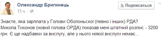 «Знаете, какая зарплата у главы Оболонской (наверное, и других) РГА? Николай Тихонов (новый глава ОРДА) показал мне штатное расписание - 3200 грн. Есть еще надбавки за выслугу, но у него никакой выслуги нет», - сообщил Бригинец.