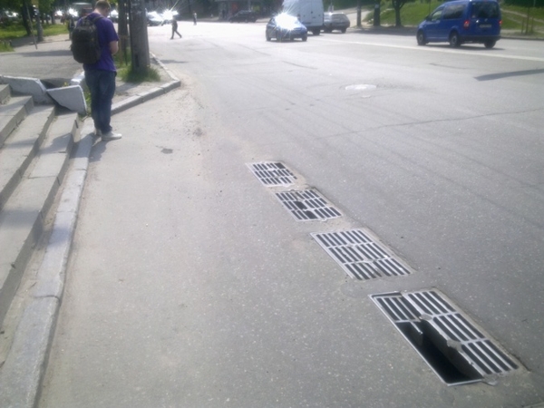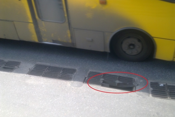 И действительно, на месте мы обнаружили большую дыру в ливнесточной решетке, автобусы и троллейбусы закрывают собой опасную ловушку, а вот маршрутки открывают двери прямо напротив провала, и люди смело выходят и заходят в нескольких сантиметрах от дыры не замечая ее. В Голосеевском ДЭУ, на чьем балансе находятся решетки, пообещали срочным образом устранить »капкан» на остановке.