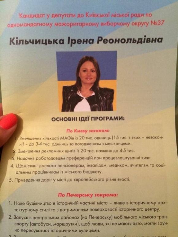 Идет на выборы и зам экс-мэра Леонида Черновецкого — Ирэна Кильчицкая. Она обещает своим избирателям бороться с МАФами, рекламными щитами, а также застраивать исторический центр зданиями, не выше уже существующих.