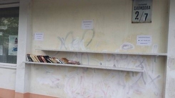 Книжные стеллажи были размещены прямо на фасаде здания на бульваре Давыдова 2/7, на пересечении с улицей Энтузиастов.