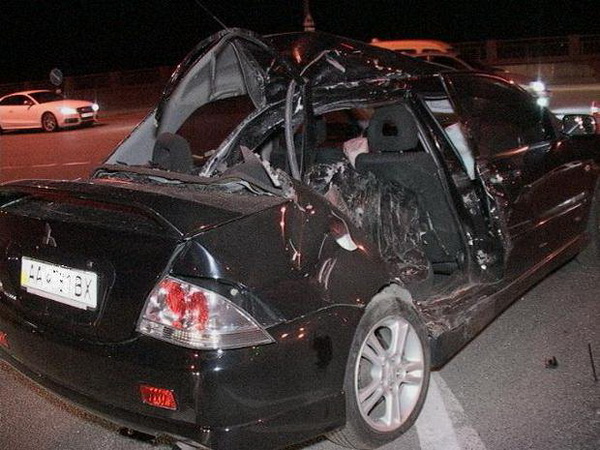 В среду вечером в Киеве, на улице Промышленной в микрорайоне Бортничи, автомобиль такси Mitsubishi Lancer протаранил стену, а затем и крышу частного дома и приземлился на микроавтобус.