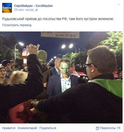 Митингующие у здания посольства России в Киеве облили зеленкой депутата Рады Николая Рудьковского (внефракционный). До этого, по просьбе со стороны пикетирующих, он бросил камень в посольство России.