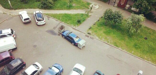В Киеве местные жители продолжают бороться с неправильно припаркованными во дворах жилых домов автомобилями с помощью мусорных баков. Они блокируют нарушителей, установив баки спереди и сзади авто.