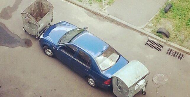 Киевляне заблокировали автомобиль-нарушитель мусорными баками (ФОТО)