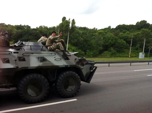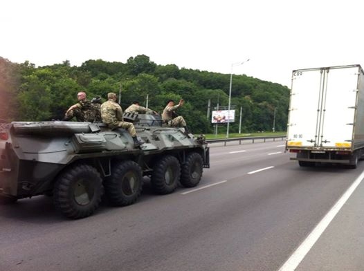 В среду утром, киевляне и гости столицы наблюдали странную картину. По Столичному шоссе, со стороны Конче-Заспы в Киев заехала колона военной техники. Несколько БТР облепленных десантниками и шесть автомобилей ЗИЛ с бойцами. На технике нарисованы эмблемы десантных войск и развеиваются украинские флаги. Сидя верхом на бронемашинах, десантники размахивали руками и приветствовали горожан. Киевляне в свою очередь настороженно наблюдали за колонной и снимали ее на видео. Военные машины в сопровождении автомобилей ГАИ заехали на Дарницкий мост и отправились в сторону левого берега. Появление в Киев военной колоны уже породило не мало слухов.