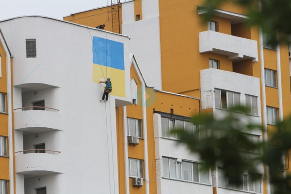 В Киеве на улице Борщаговской, 145 на стене многоэтажного дома нарисовали гигантский флаг Украины. Работы начались в среду после обеда – промышленный альпинист при помощи специального снаряжения поднялся на самый верх дома с желтой и синей красками. Прохожие с любопытством наблюдали за происходящим.