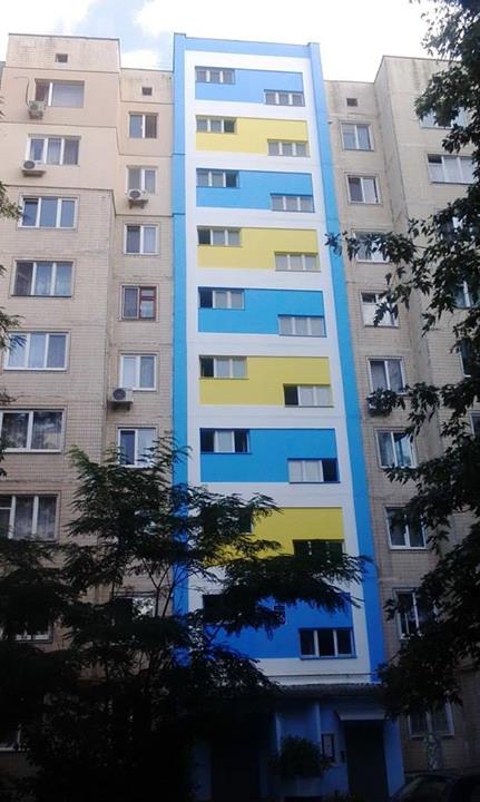 Киевляне не устают проявлять фантазию в патриотическом украшении города. На Оболонском проспекте, 36 целый подъезд 9-этажного дома раскрасили синим и желтым цветами.