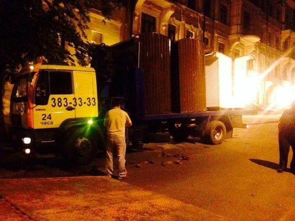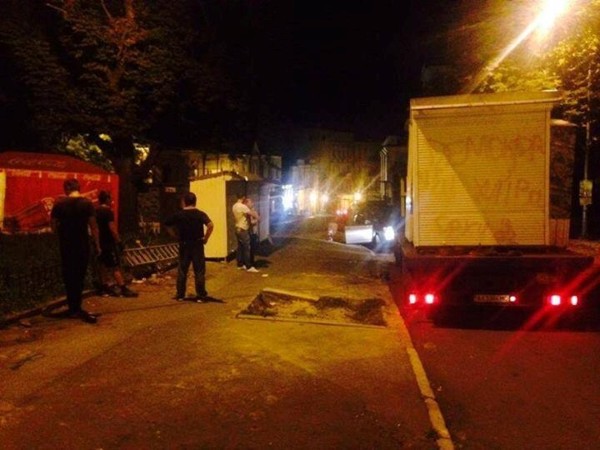 Ночью на Андреевском спуске снесли незаконные МАФы, за которыми невозможно было разглядеть исторических построек. В одинаковых ларьках торговали сувенирной продукцией для туристов. Здесь продавали чашки, матрешки, вышиванки, магнитики в виде сала и многое другое.