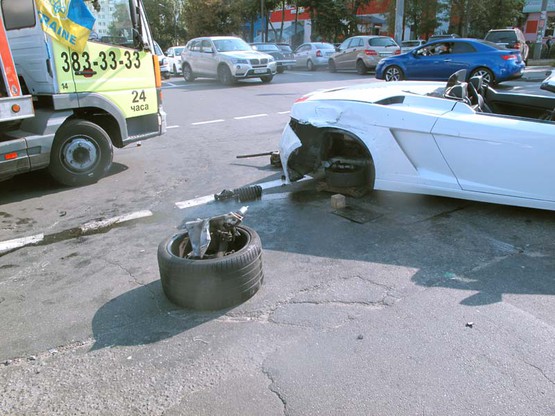 Удар был такой силы, что у люксового Lamborghini вырвало колесо.