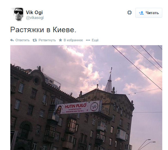В столице Украины появились рекламные растяжки над дорогами с знаменитой фразой футбольных фанатов о президенте Российской Федерации Владимире Путине. Фотофакт появился в Twitter у пользователя Vik Ogi.