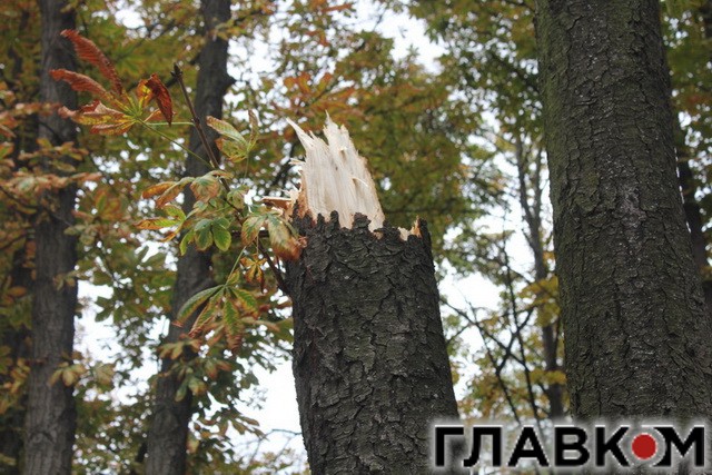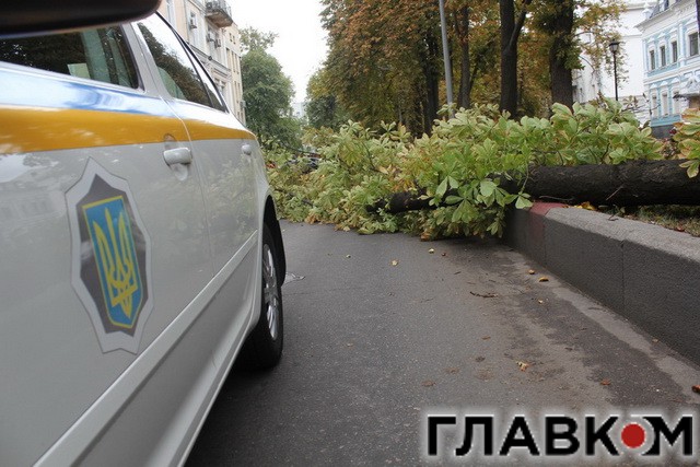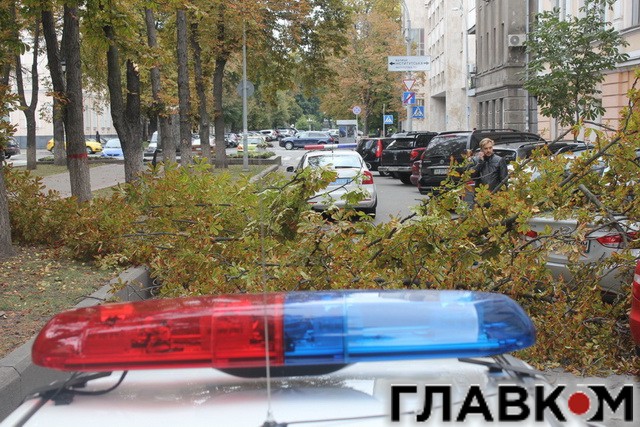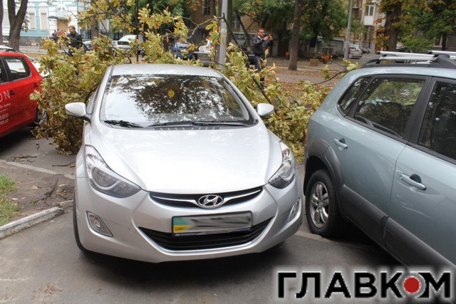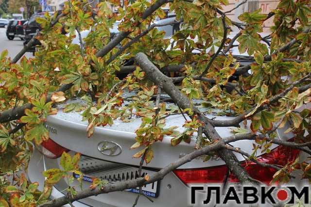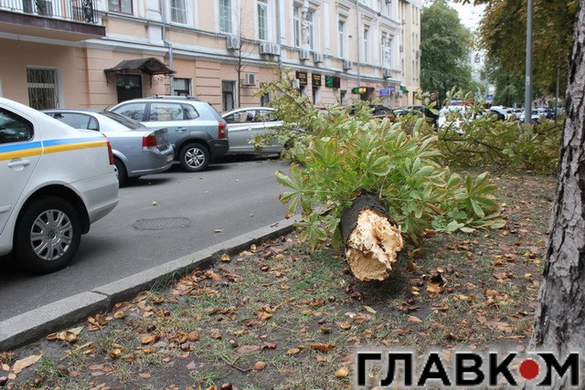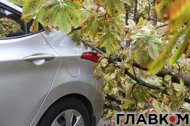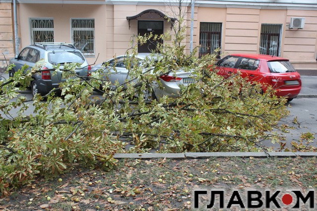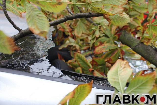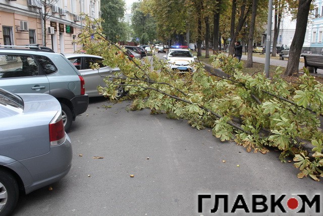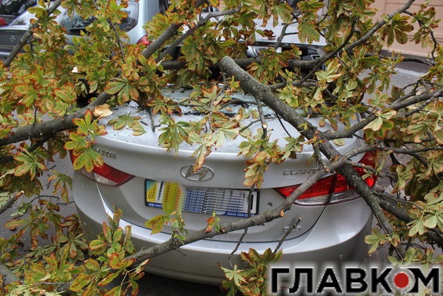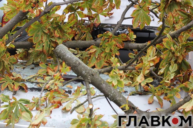 В центре Киева на улице Липской рухноло дерево, не выдержав порывов ветра. Огромная ветка каштана упала на припаркованный автомобиль.