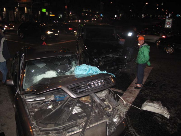 Все случилось в ночь с пятницы на субботу в самом центре Киева, а именно на пересечении улиц Красноармейской, Крещатик и бульвара Шевченко, неподалеку Бессарабского рынка. Как рассказывает один из пострадавших, он двигался на своей Audi А6 от Красноармейской в направлении Европейской площади.