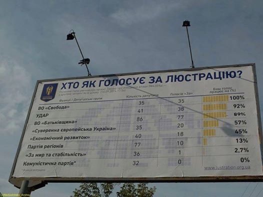 В Киеве появились рекламные щиты с информацией о том, какая фракция и как проголосовала за принятие Закона о люстрации.
