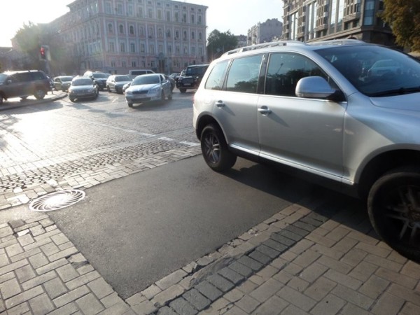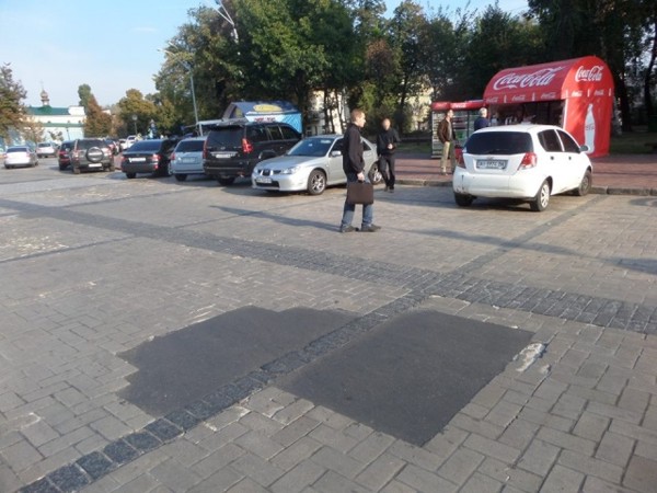 Дорожное покрытие Михайловской площади за последнее время сильно пострадало: во время протестов на Майдане для машин открыли транзит по Трехсвятительской и туристическая площадь превратилась в проезжую часть, сообщил журналист Григорий Мельничук на своей странице в соцсети Facebook. Также журналист выложил несколько фотографий, в доказательство написанному.