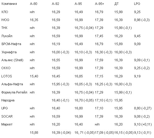 Розничные цены на бензин и дизельное топливо в Киеве 15 октября 2014 г., по сравнению с предыдущим торговым днем, снизились в среднем на 5 копеек, на сжиженный газ - в среднем на 11 копеек. Об этом свидетельствуют данные мониторинга ценового департамента "Консалтинговой группы А-95".