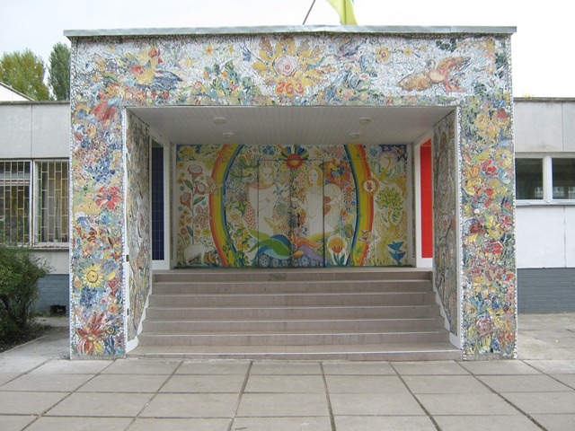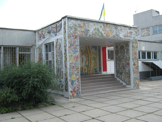 Парадный вход общеобразовательной школы № 263 им. Евгения Коновальца по улице Сабурова, 19-б, украсили мозаикой и монументальной живописью.