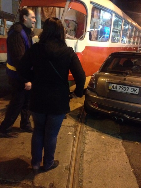 В Киеве на улице Спасская из-за неправильно припаркованного автомобиля трамвай не мог проехать полтора часа.