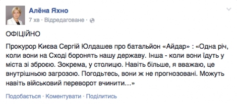 «Официально. Прокурор Киева Сергей Юлдашев о батальоне «Айдар»: «Одно дело, когда они на Востоке защищают наше государство. Другое – когда они едут в города с оружием. В частности, в столицу», – пишет на своей странице в Фейсбук глава пресс-службы Киевской прокуратуры Алена Яхно.