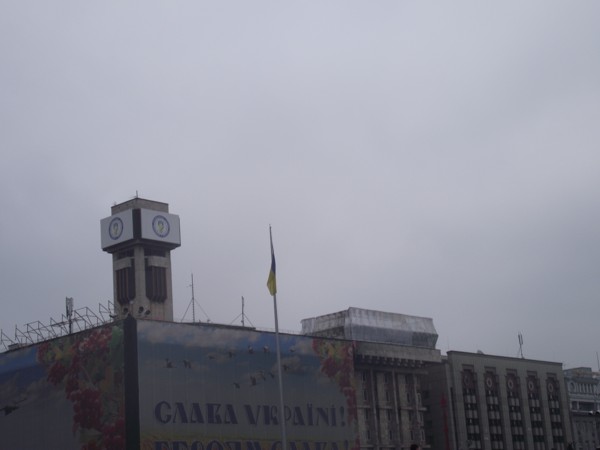 Надстройку на киевском Доме профсоюзов, который сгорел в феврале этого года во время противостояний на Майдане, обернули пленкой.