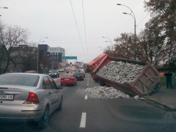 В Киеве на Краснозвездном проспекте,73 произошла авария: перевернулся на бок грузовик с камнями. Часть из них высыпалась на дорогу. По словам очевидцев, у грузовика оторвались колеса.