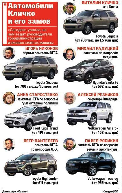 В КГГА говорят, что со времен мэра Омельченко осталась и старая Toyota Land Cruiser 100. Но пользоваться ею сейчас невыгодно, машина неэкономная, расход топлива очень высокий. Поэтому из гаража Land Cruiser не выезжает. Служебными машинами пользуются в основном рядовые сотрудники, а вот руководство города — и глава, и его замы — ездят на работу на личных "колесах".