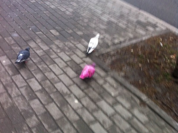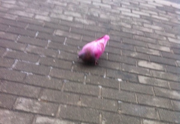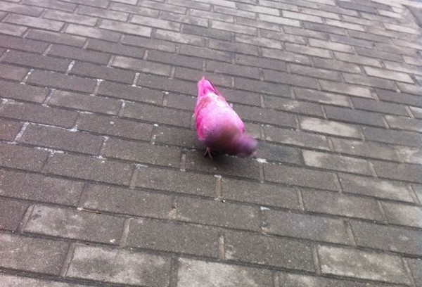 В Киеве на улице Артема появились странные голуби необычной раскраски – ярко розового цвета с фиолетовым оттенком. Птицы резко выделяются на фоне своих сородичей, которые преимущественно черного, серого или белого цвета. Откуда взялись необычные голуби и кто покрасил их в розовый – загадка. Возможно, над пернатыми пошутили киевляне, отметив таким образом Новый год.