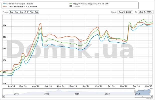 По данным информационно-аналитического отдела Domik.ua , в ушедшем 2014 году подорожание в национальной валюте коснулось всех без исключения сегментов на вторичном рынке жилой недвижимости.